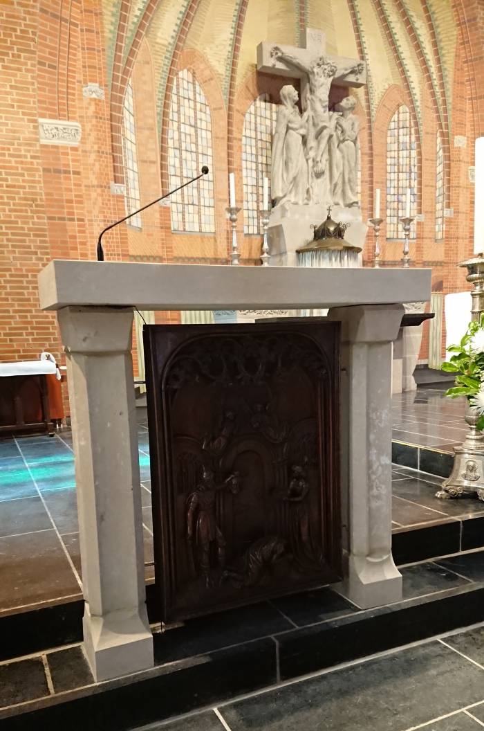Nieuwe ambo met hergebruik paneel Sint Jans Onthoofding