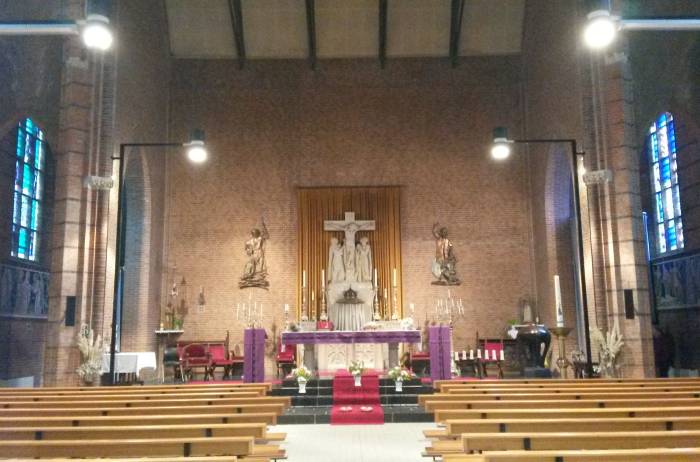 Het kleurenpallet van de bijzondere kruiswegstaties is als basis gebruikt om de nieuwe herinrichting te verenigen met de kerk in zijn verschillende voorafgaande bouwfasen. Ook de kunst- en liturgische objecten uit beide kerken maken hier deel van uit, waarmee onder andere een nieuwe ambo ontworpen is.
