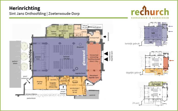 Het samengaan van twee kerken met verschillende identiteiten in één kerkgebouw is een fijngevoelig proces. Vooral in een oud kerkgebouw, waar de tijd zijn geschiedenislagen heeft achtergelaten. De ene helft van de kerkgangers heeft zijn gewoonten daarop ontwikkeld, terwijl de andere helft een geborgen plek achterlaat. In Zoeterwoude-Dorp is besloten de nieuwere Christus Dienaarkerk te sluiten. De Sint Jans Onthoofding met zijn littekens van de brand uit 1964 krijgt een herinrichting. Een slimme plattegrond (BAB) groepeert gebruiksruimten rondom een door glas afgesloten kerkzaal.